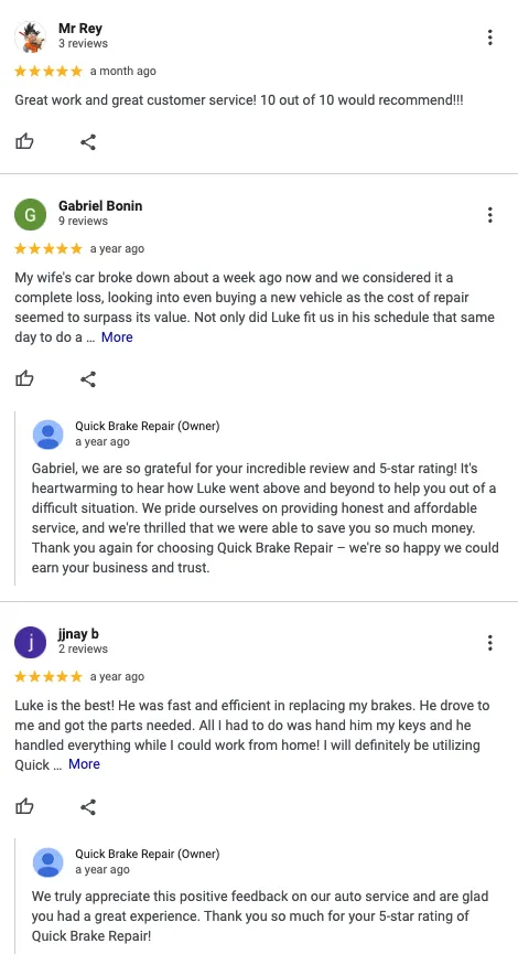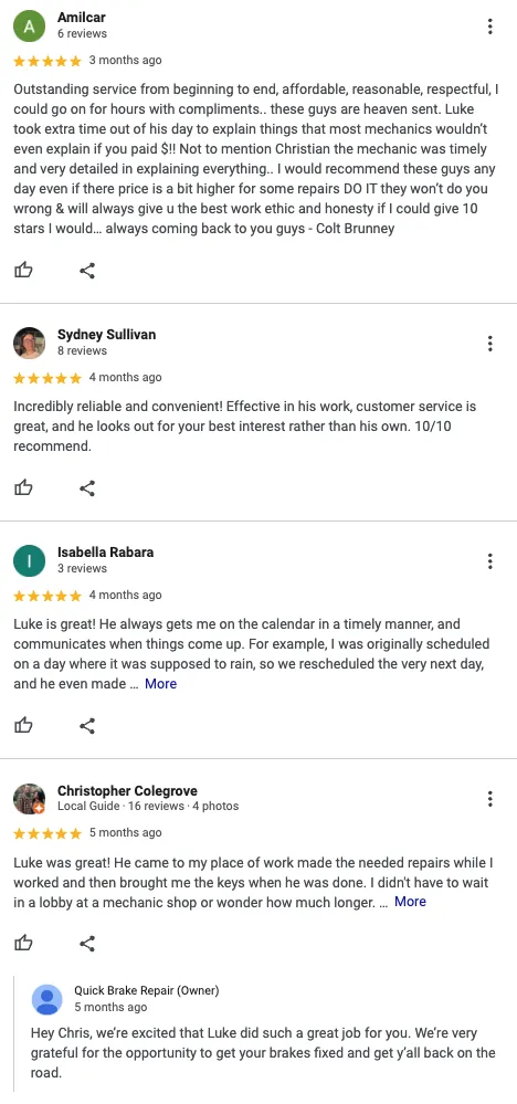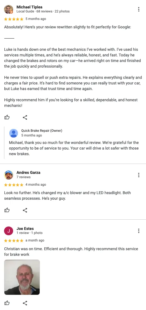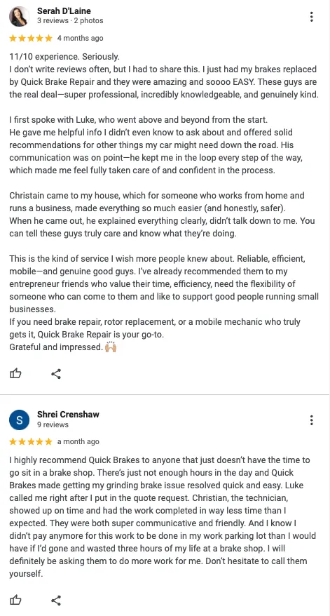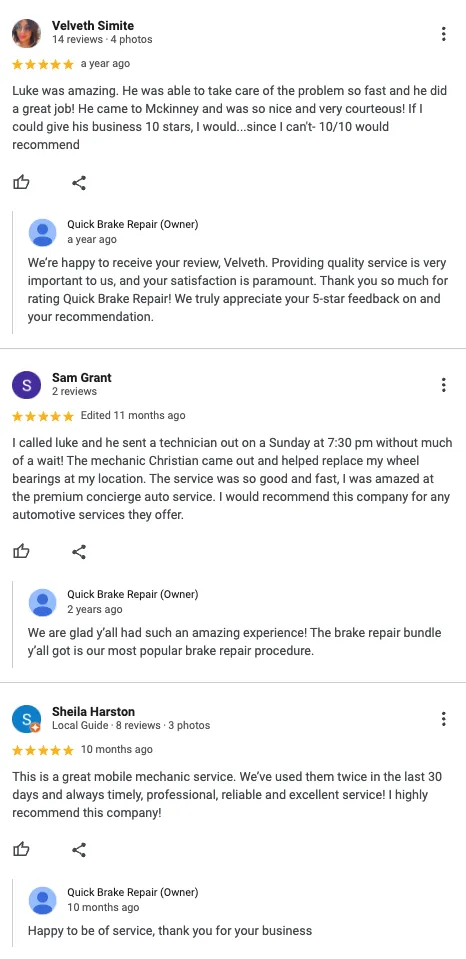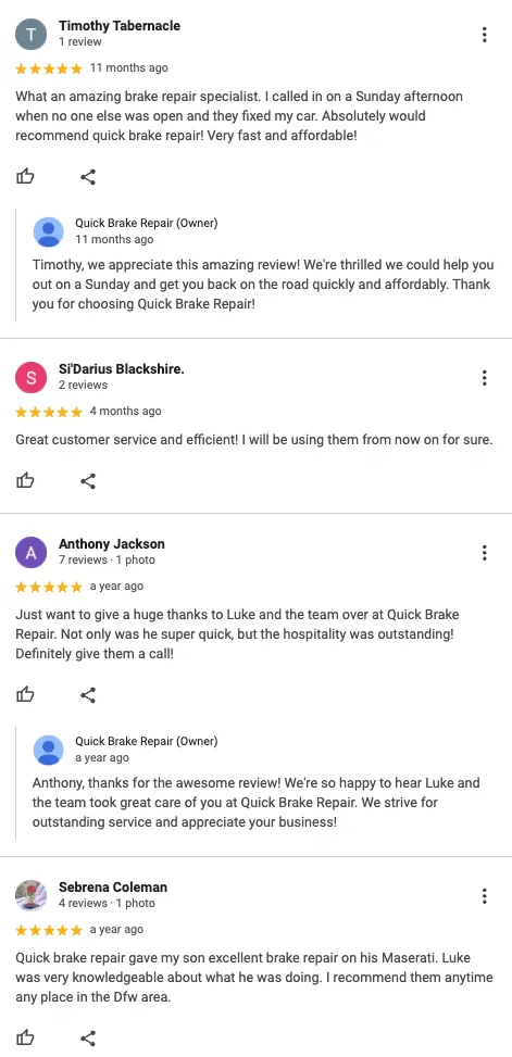 Quick Brake Repair is a mobile mechanic service based in Dallas, TX. We provide top-notch brake repairs, comprehensive car maintenance and engine repair services. Are your brakes making a strange and unusual squeaking sound? Trust our brake repair company for all your auto troubleshooting needs in Dallas, TX and surrounding communities.